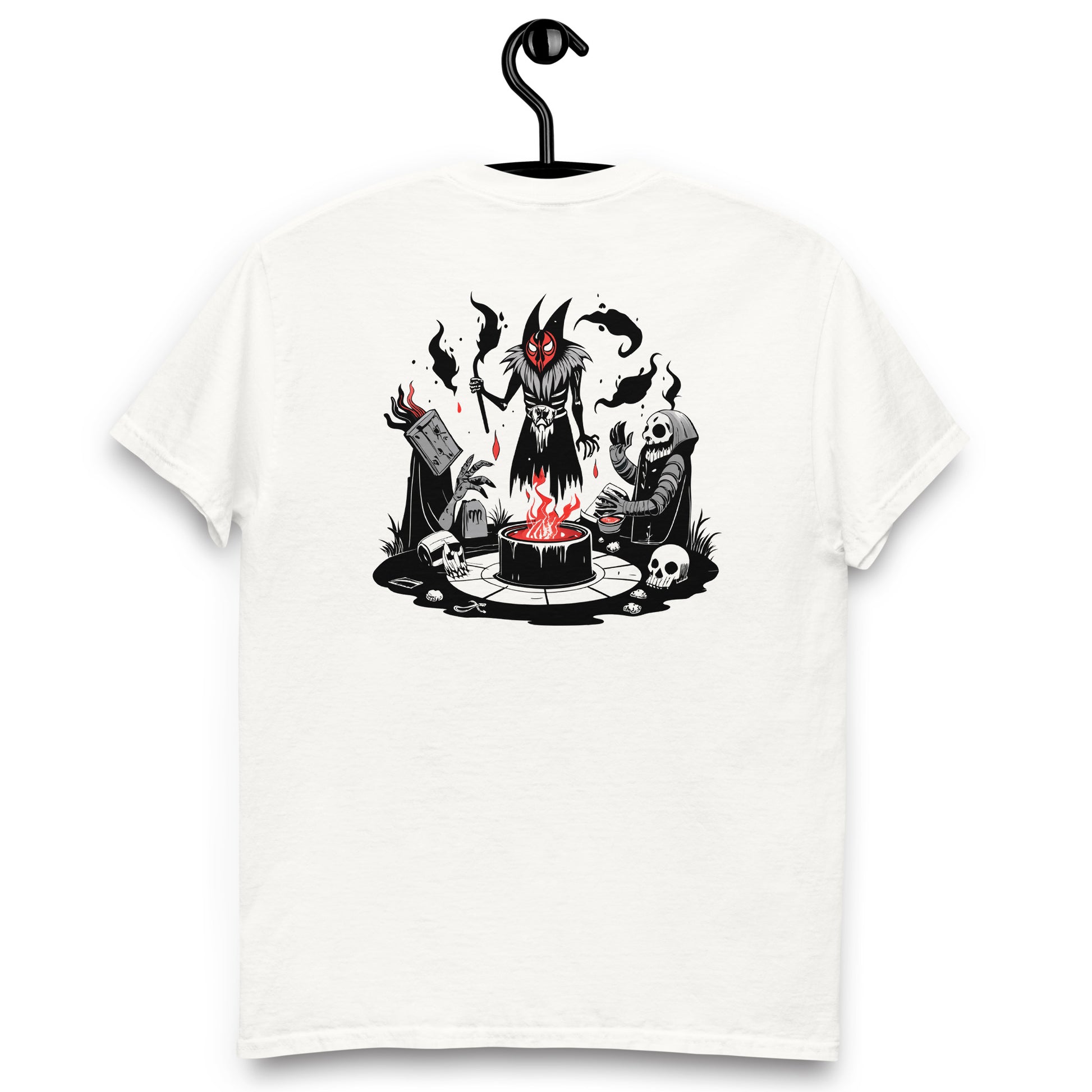 Unleash the dark arts with the Summoning T-Shirt from Cursed. This white tee is more than just a piece of clothing—it's an invocation. On the front, a masked shaman stands ready, preparing the ritual above the powerful Cursed name. But the true magic lies on the back, where three creatures are locked in a sinister ritual, conjuring a demon from the depths.